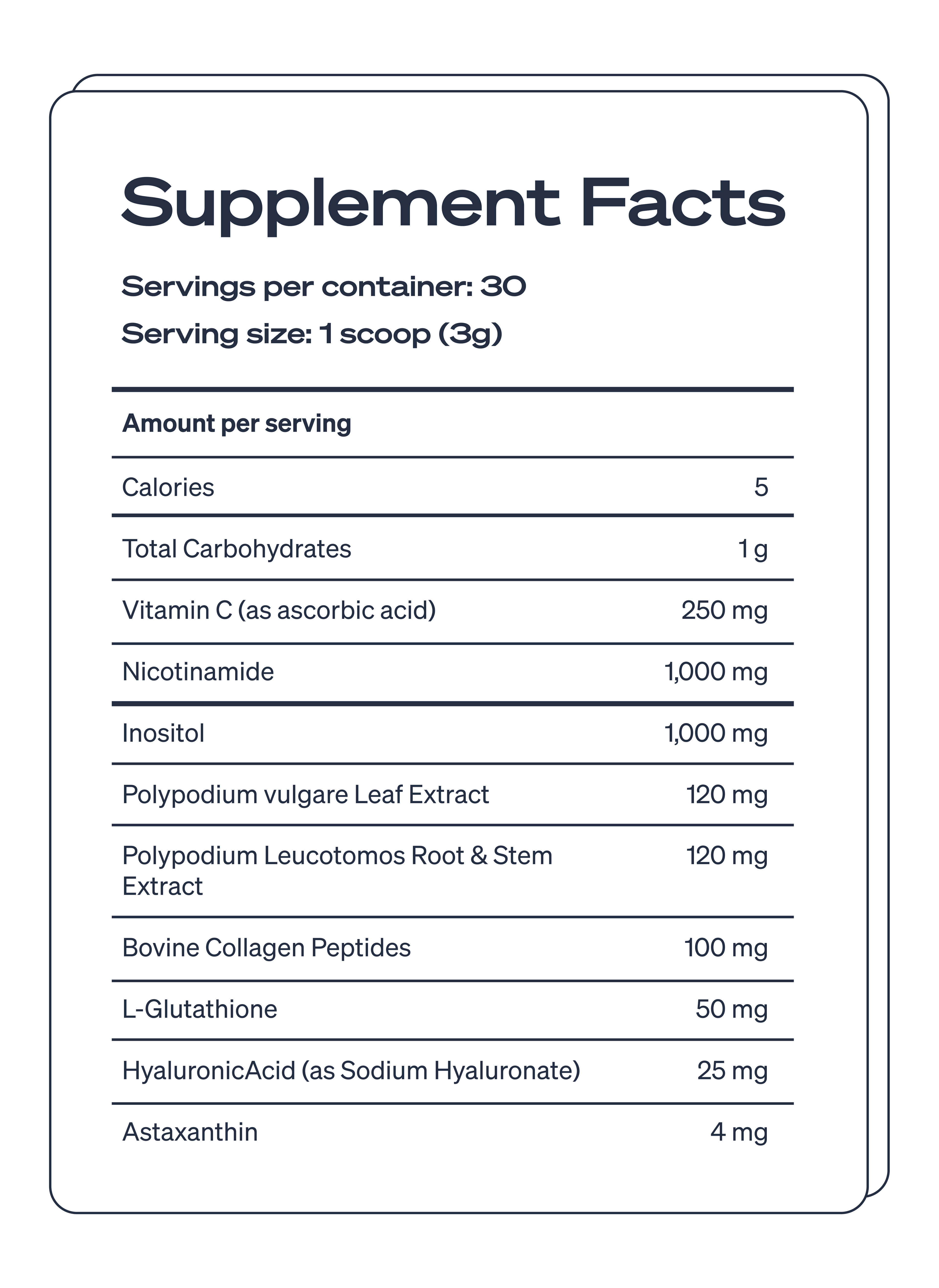 Hydrolyzed bovine collagen peptides that support your skin's structural foundation. They help improve skin elasticity, hydration, and firmness while working synergistically with Vitamin C and Astaxanthin to limit collagen breakdown caused by sun exposure.